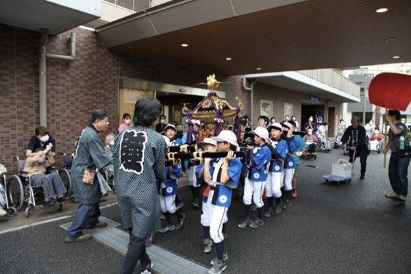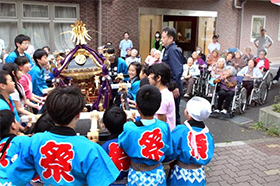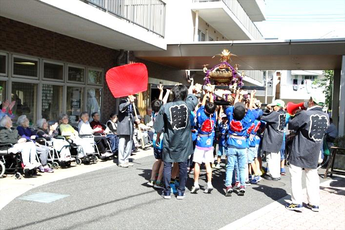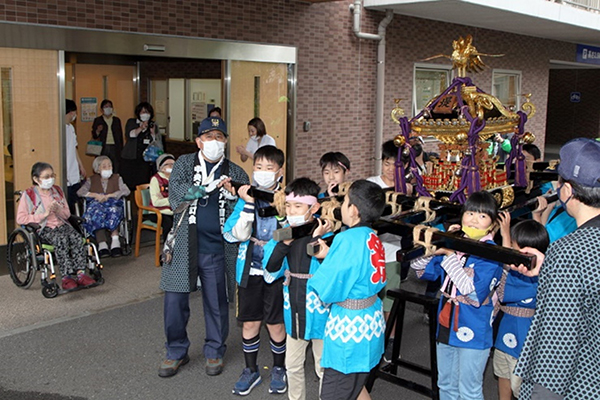 町内の高齢者施設のおじいちゃん、おばあちゃんにもお神輿をお披露目して、とても喜んでいただきました。
