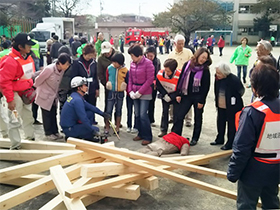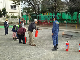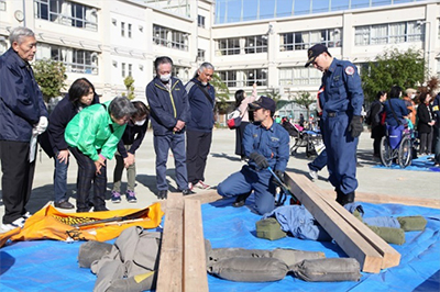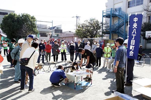 11月12日に中央八丁目、堤方東、市野倉南の三町会合同で学校防災活動拠点訓練を池上第二小学校で実施しました。今年も倒壊家屋からの救助訓練や消火訓練などいろいろな訓練を実施しました。