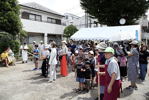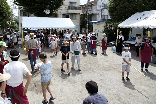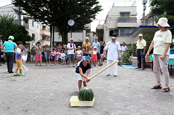 大変暑い日が続いていましたが、テントを張って熱中症の防止につとめました。子供たちはとても元気で暑さに負けずにスイカをたたいていました。