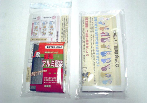 東京都作成の防災用チラシ(東京都知事の防災メッセージと日頃の防災への備え)と保温「アルミ寝袋」を町会会員 1000 世帯(一部非会員も含む)に配布しました。
