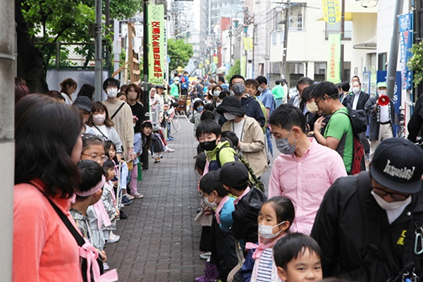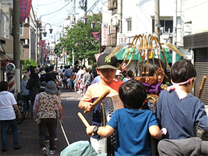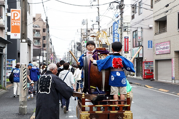 雨が降ったり止んだりのあいにくの天気でしたが、山車巡航の時間には幸運にも雨がやんで、たくさんの親子連れで賑わいました。