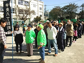 11月19日(日)午前8時30分より、中央八丁目、堤方東、市野倉南の三町会合同で学校防災拠点訓練を池上第二小学校で実施しました。今年は大森消防団第五分団のみなさんも参加していただきました。