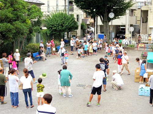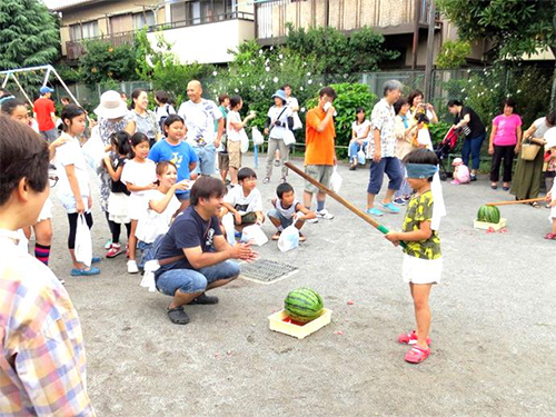 7月29日(日)に中央八丁目文化児童公園で親子スイカ割り大会を開催しました。台風が通過していたので開催が危ぶまれましたが、子供たちの願いが台風を押しやったようで無事に実施することができました。