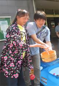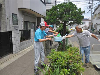 今回は、玄関前販売に併せて、大田区の打ち水事業へも参加しました。