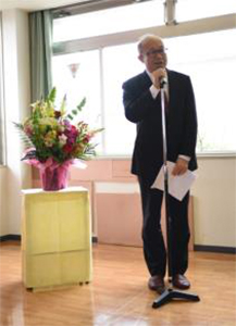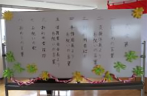 4月4日入園式が行われました。今年度は5名の新利用者を迎え、事務局長からお祝いの言葉を頂きました。池上福祉園で楽しい思い出いっぱいつくりましょうね。