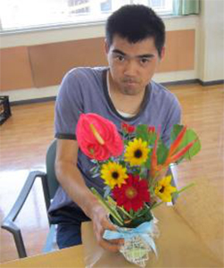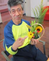 明るい色のお花にみんなにっこりです。アレンジする入れ物も手作りです。
