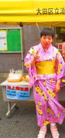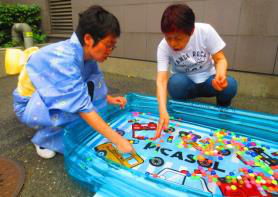 7月の玄関前販売は浴衣を着てお出迎え。スーパーボールすくいに、打ち水をして盛り上がりました。