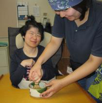 音楽レクではみんなノリノリ♪ 茶道では和菓子を頂きみんなにっこり。