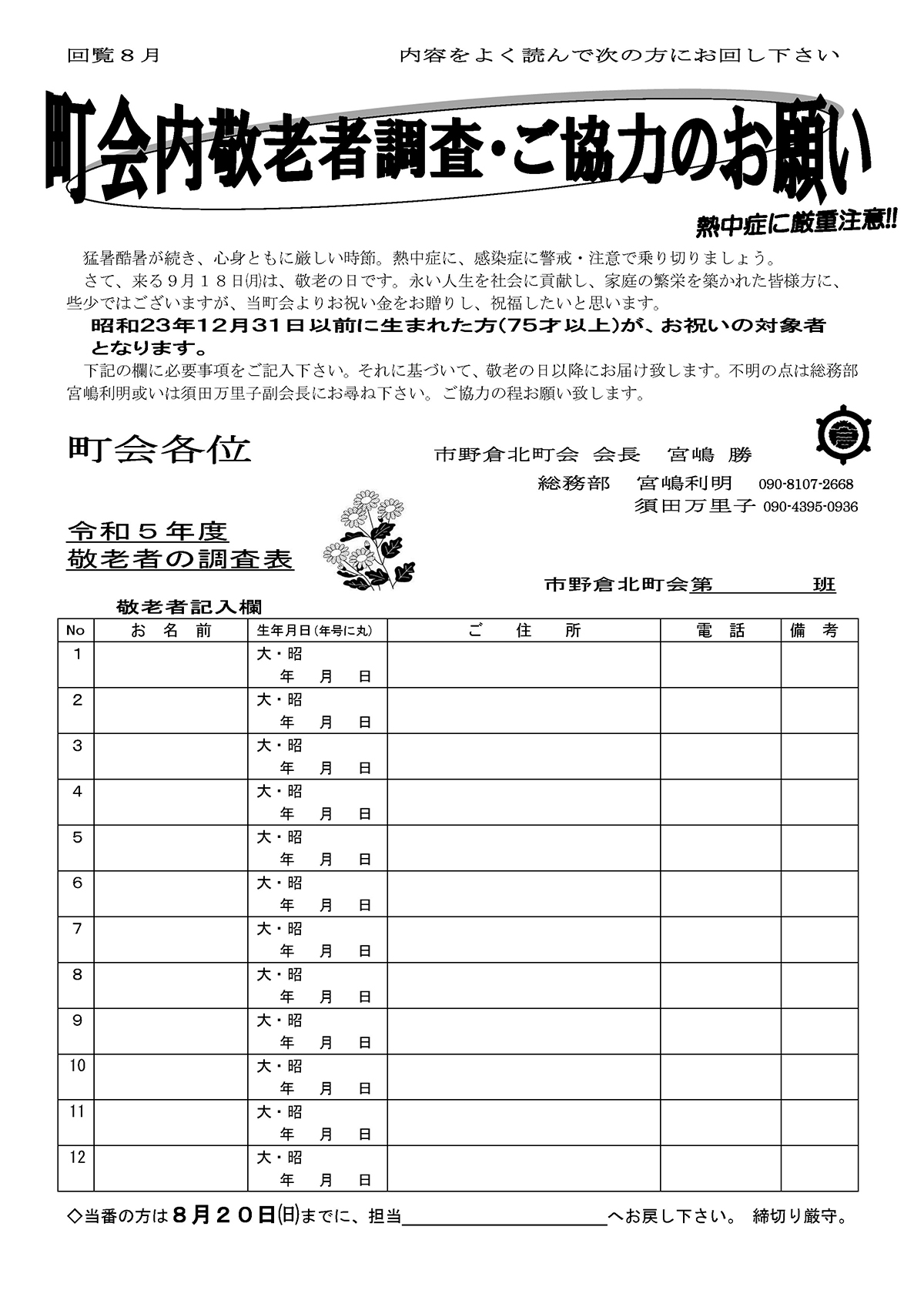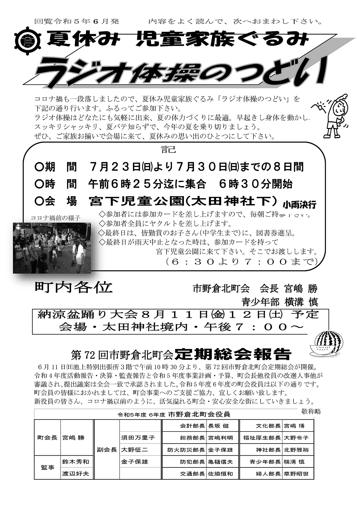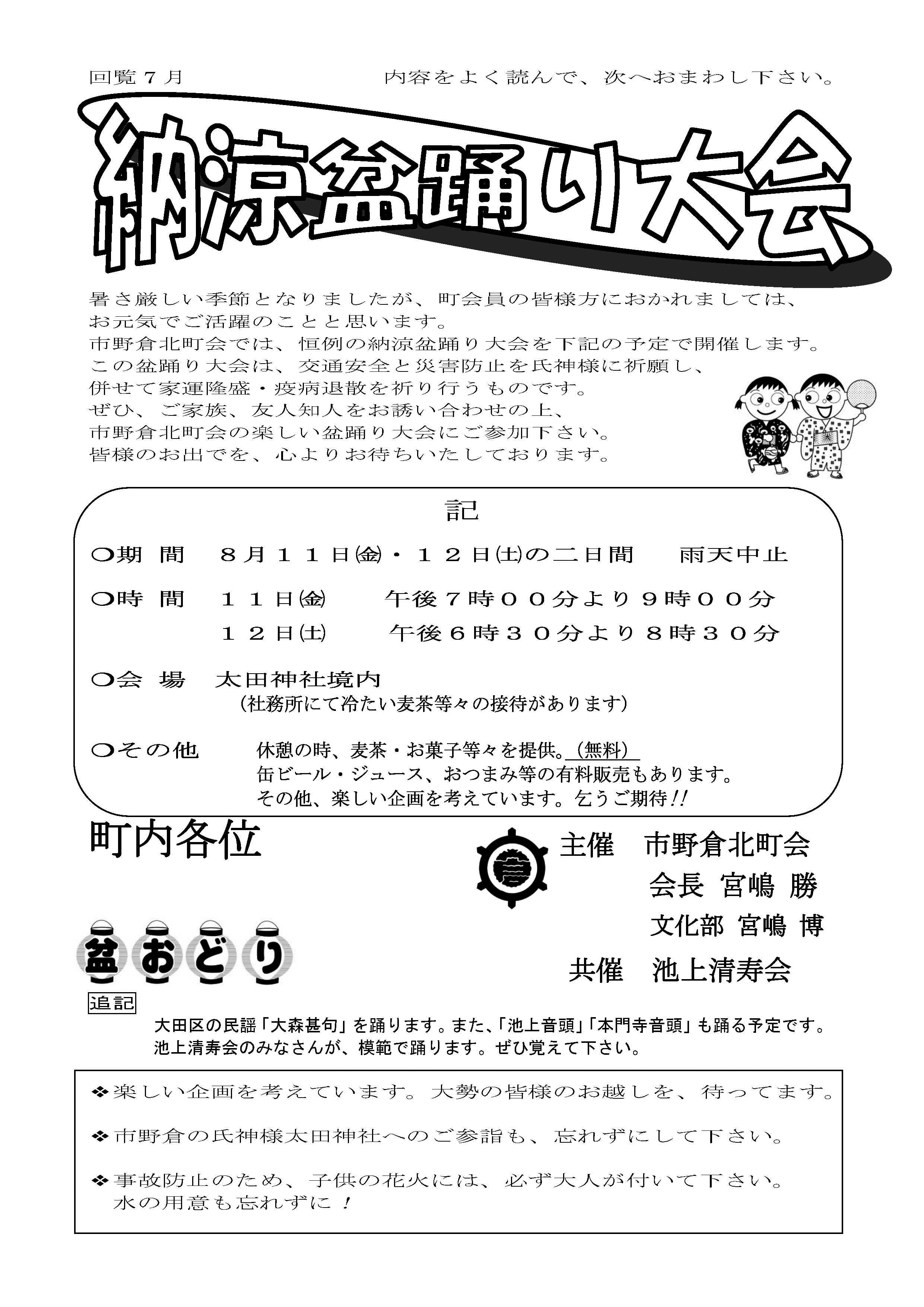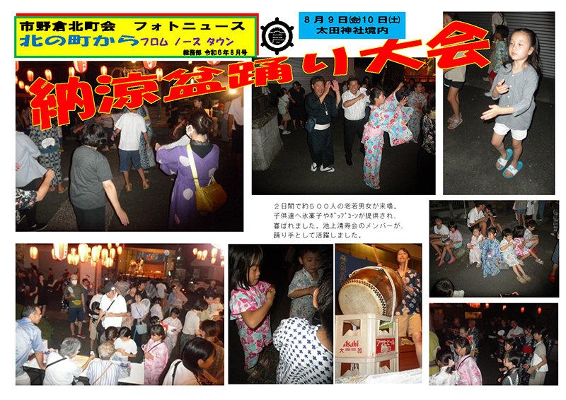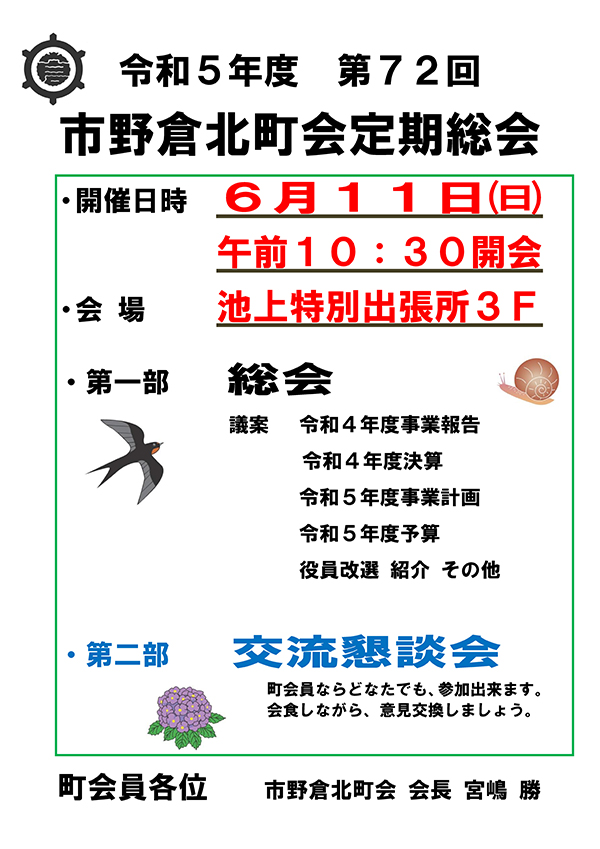 こんな季節感の中で市野倉北町会は年を重ねてきました。当たり前に続けてきたことを大切に、次世代またその次の世代へと渡していきたいと、町会長他役員は思っています。大きなマンションが建ち、建売住宅も増えました。古くから住み続けている方達、新たに住み始めた方達、なにはともあれ、ずーと住んでいたい町にしていきましょう。