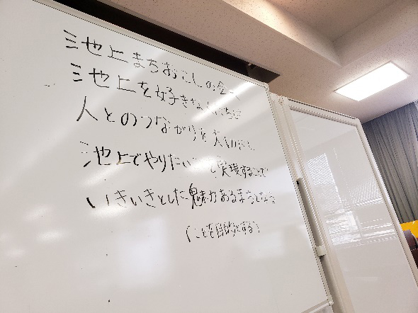 これまでの意見交換やワークショップを踏まえ、内外を問わず「池上が好きな人」をターゲットとしながら、「池上でやりたい!」を実現することが、新たなまちの力になるのではないか。また、こうした会の活動を通じ、「人のつながりを作り出すことに価値を置き、池上が住みやすく・魅力的なまちとなるよう、貢献をしていきたいと議論を深めました。