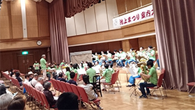令和6年8月25日(日曜日)に池上会館と池上小学校周辺にて第19回池上まつりを開催しました! 開会式は、大森第四中学校吹奏楽部の演奏とともに池上会館前の野外ステージにて行われました。 写真:開会式 写真:フラダンス 写真:バンド演奏 写真:野外ステージの賑わい