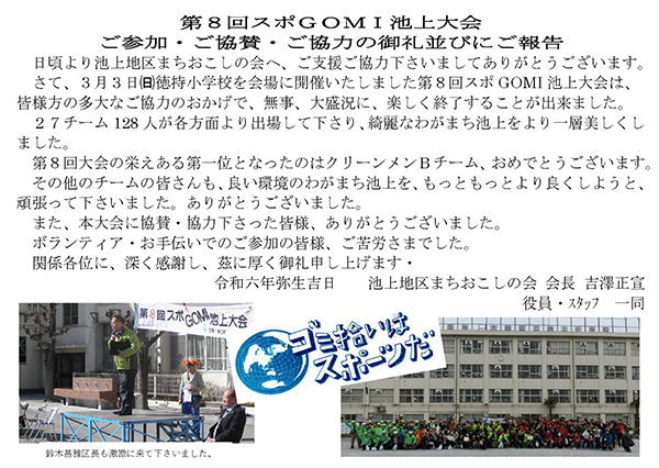 スポーツ感覚でゴミ拾いを楽しみながら、一緒に池上のまちをもっともっと美しくしましょう。